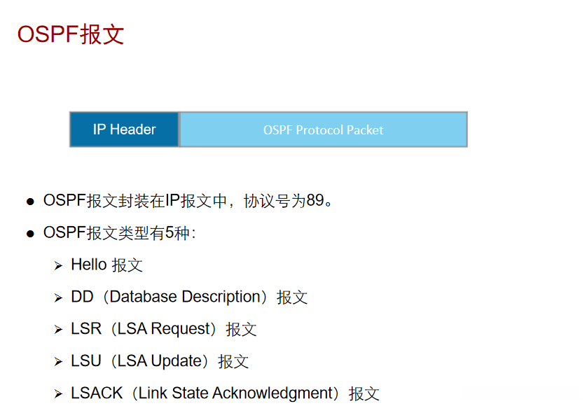 Hello报文:主要采用的报文类型,用于建立和管理邻居之间的通信关系。在广播型网络及无广播多接入(NBMA)网络中选择指定路由器DR和备份指定路由器BDR。