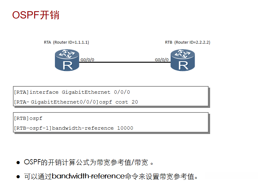 此外也可以由ospf cost命令手动调节一个接口的开销情况并规定其取值范围在1至65535之间,默认设置为1