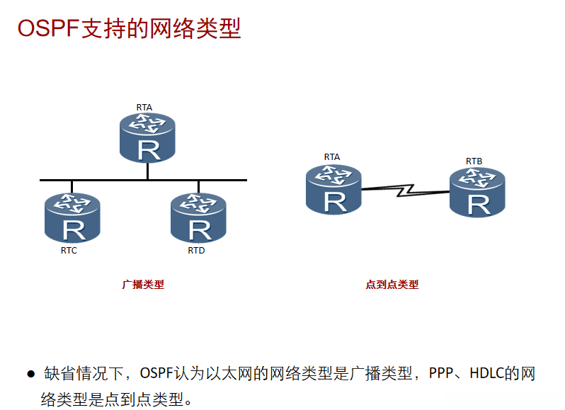 OSPF划分为四类网络体系:包括:点对点网络、广播式网络、NBMA体系和多播型网络。