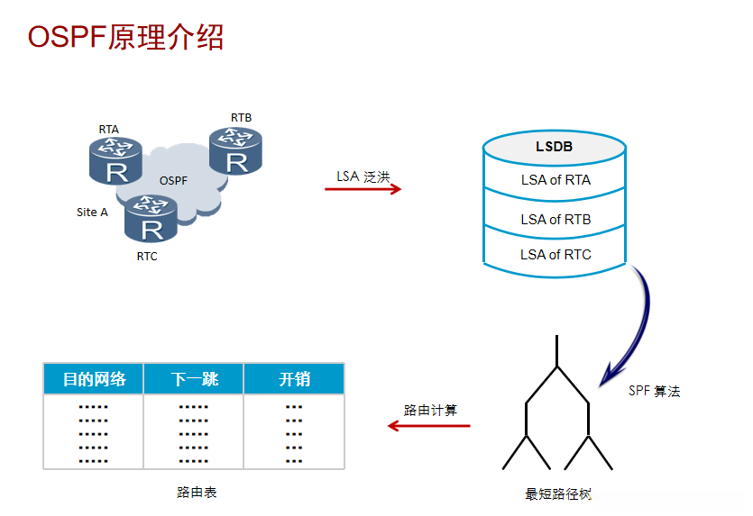 OSPF规定所有OSPF路由器必须掌握网络拓扑结构的相关链路状态信息以便计算出前往目标节点的最佳路径。为此(OSPF协议)通过广域发送LSA消息启动收敛过程(Least Mean Square算法)来实现这一目标。每个LSA字段都记录了路由器所知接口的信息包括IP地址掩码开销值以及网络类型等数据当某台路由器接收到LSA消息时会利用这些数据构建自身完整的链路状态数据库(LSDB)然后基于构建好的链路状态数据库应用最短路径树算法进行计算从而求解从该节点到各个子节点之间的最短路径树结构最后通过所计算出的最短路径树确定最佳路由策略并将此最佳路由策略加入当前节点的IP路由表中完成配置过程