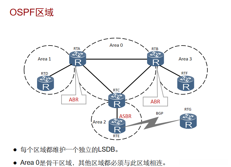 在相邻的区域之间工作的路由器被称为区域边界路由器ABR(Area Boundary Router),它们汇总并存储所有相连区域的LSDB信息。连接到其他自治系统中的路由器并负责交换路由信息的设备称为自治系统边界路由器ASBR(Autonomous System Boundary Router)。这种类型的路由器会向整个自治系统发送有关外部路由的信息通知。