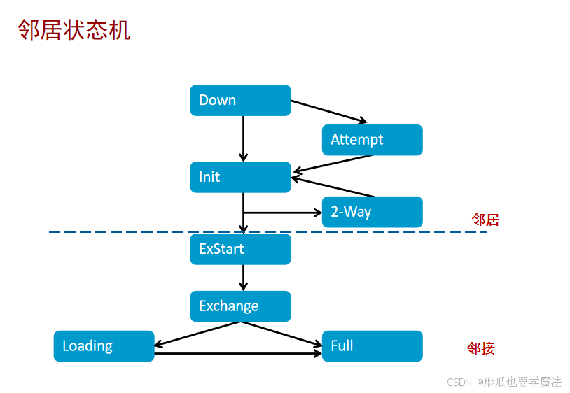并非所有形成邻居关系的双方都能建立邻接关系;具体取决于网络类型。仅在双方成功传输DD报文并交换LSA之后,才能真正建立邻接关系。