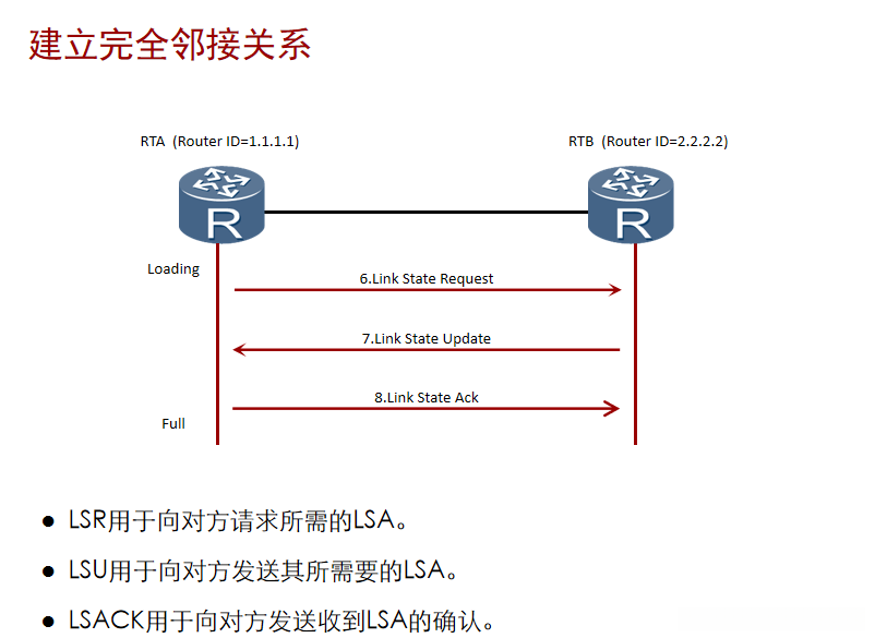 Loading:互相发送LSR报文向LSA发起请求;Full:路由器的LSDB已经完成同步过程。