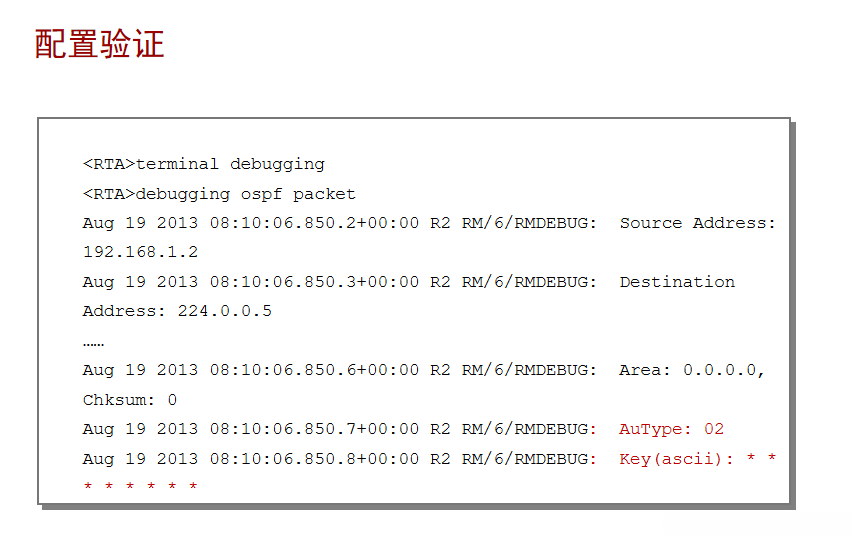 该命令用于启动OSPF报文调试功能,并随后将能够审查认证流程以便确认配置是否正确设置。