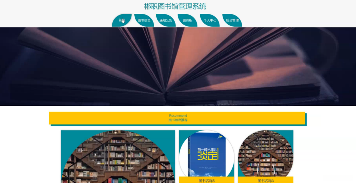 郴职图书管理系统位于首页,在首页可浏览图书信息、查看通知公告、访问留言板以及使用个人中心进行个性化设置,并通过后台管理模块完成详细的操作流程;如图5-1所示。