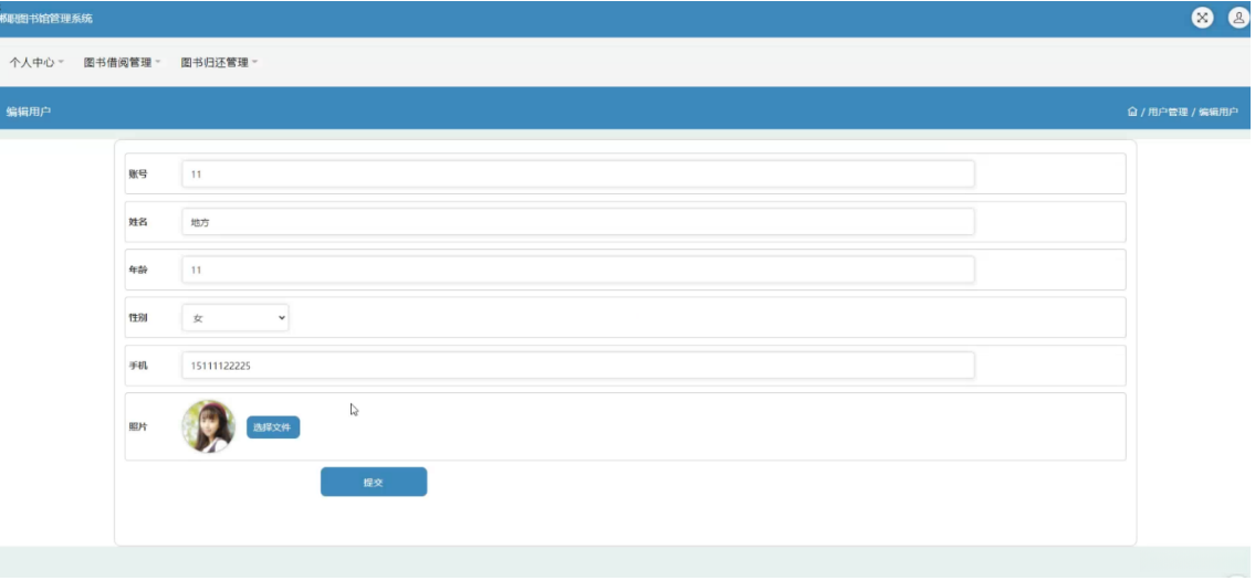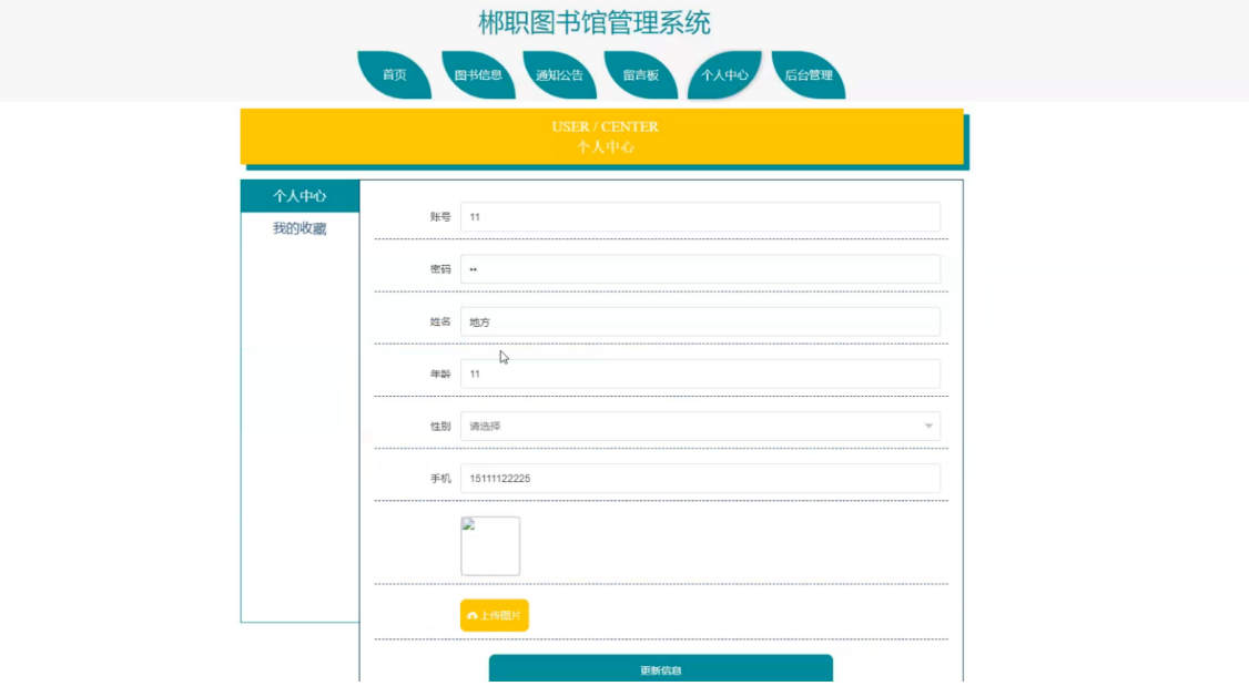 在个人中心位置上,在个人中心页面录入注册账号、登录密码、个人信息(包括姓名、年龄、性别)、手机号码以及上传本人正面生活照片等各项信息以完成更新操作(如图5-4所示)。