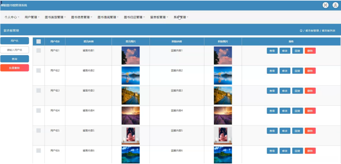 在该页面上提供留言板管理功能,在该页面上允许用户查看用户名、留言内容、图片以及相关操作;如图5-12所示
