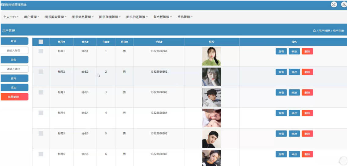 在用户管理界面中进行操作,在用户管理页面上支持查看和管理账号信息(如用户名/昵称)、出生日期(即姓名)、个人属性(如性别)、联系方式(即手机)、以及个人头像等内容,并且包括查看、编辑以及删除功能。