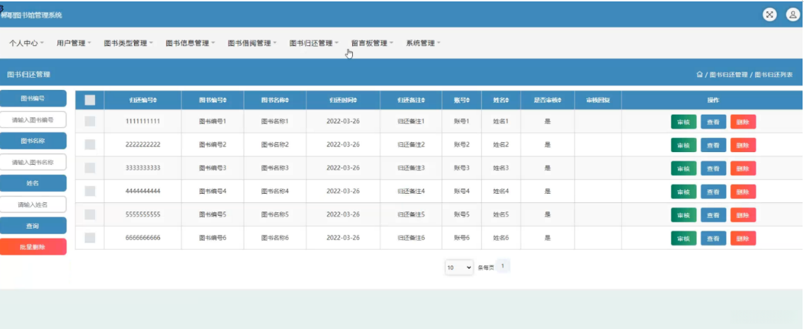 在图书归还管理模块中,在线图书归还管理页面中可以对归还编号字段、图书编号字段、图书名称字段等具体的信息项(包括归还时间字段、归还备注字段、账号字段、姓名字段等)执行审核操作,并提供查看和删除相关记录的功能;如图5-11所示