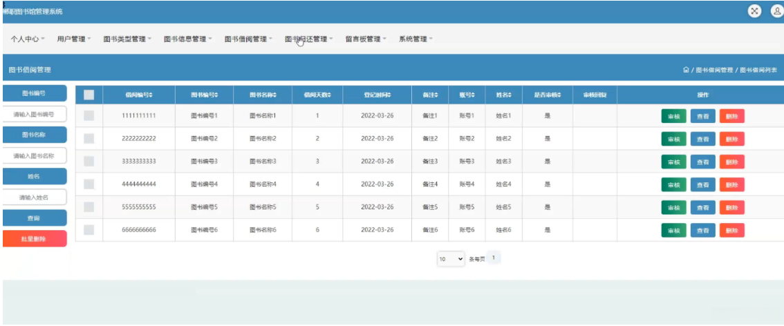 图书借阅管理系统,在该页面提供多项功能操作。支持对以下各项内容进行审核:包括但不限于借阅编号、图书编号、图书名称、借阅天数以及登记时间等基础信息;同时还可以处理备注信息,并允许用户设置相关参数如账号与姓名等个人属性;此外系统还具备审核与发布操作功能,在完成各项信息验证后即可完成对应的操作流程