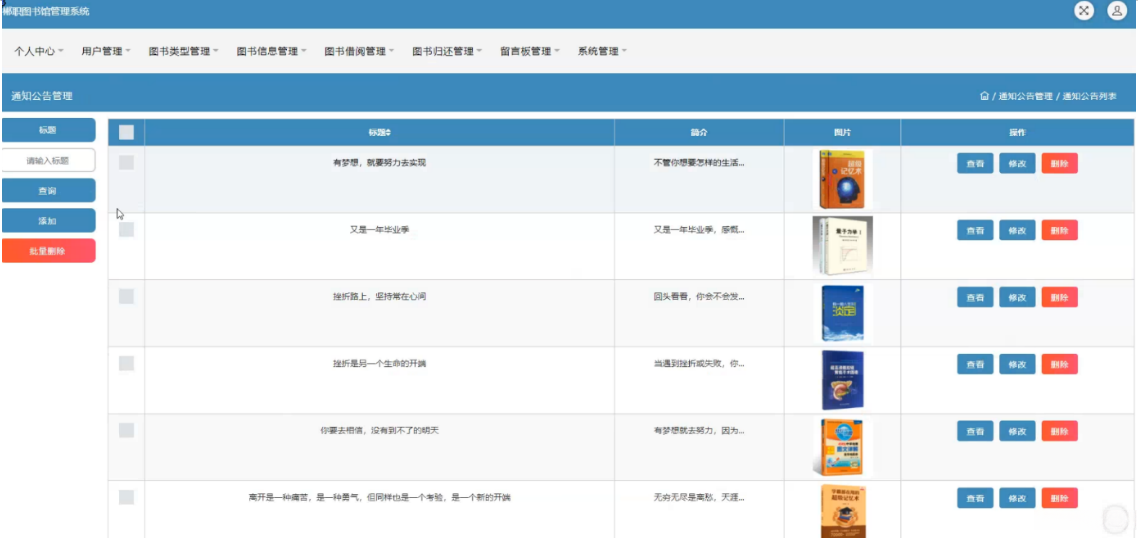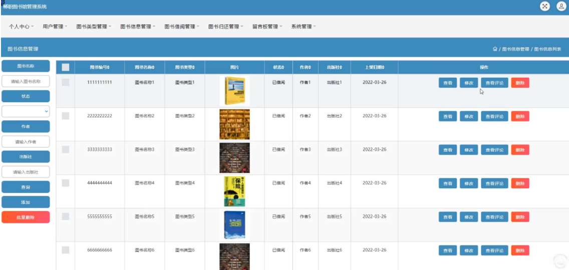 该系统中图书信息管理模块提供了丰富的功能,在特定的图书信息管理界面中可实现对图书编号、书名、种类、图片资料、状态标记、著者信息以及出版社等基本信息项的完整生命周期管理功能。该模块支持查看记录、更新数据以及阅读评价等功能,并通过直观的操作界面方便用户完成相关业务处理(如图5-9所示)。