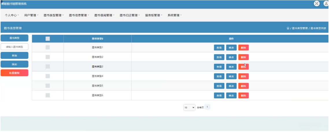 在完成系统登录后,在线管理员即可具备对主页、个人中心、用户管理、图书类型管理、图书信息管理、图书借阅管理和图书归还管理和留言板等各项功能的操作权限。