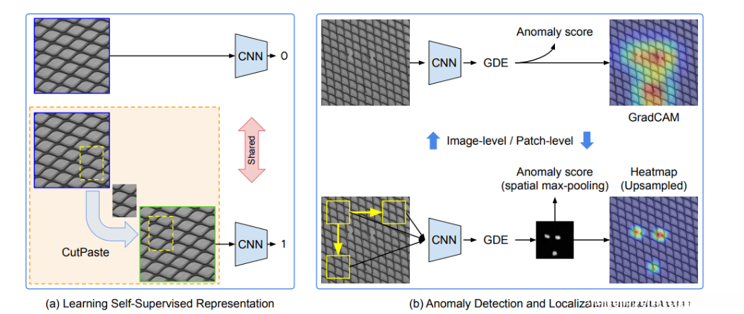 2.在异常检测及定位阶段,CNN用来提取特征,高斯概率密度估计(GDE)使用CNN提取的特征计算异常分数,图像级别的异常检测可以使用GradCAM大致定位异常区域;patch级别的异常定位,对原图分割成若干patch,分别送到CNN--GDE计算异常分数,得出更细粒度异常热力图。
