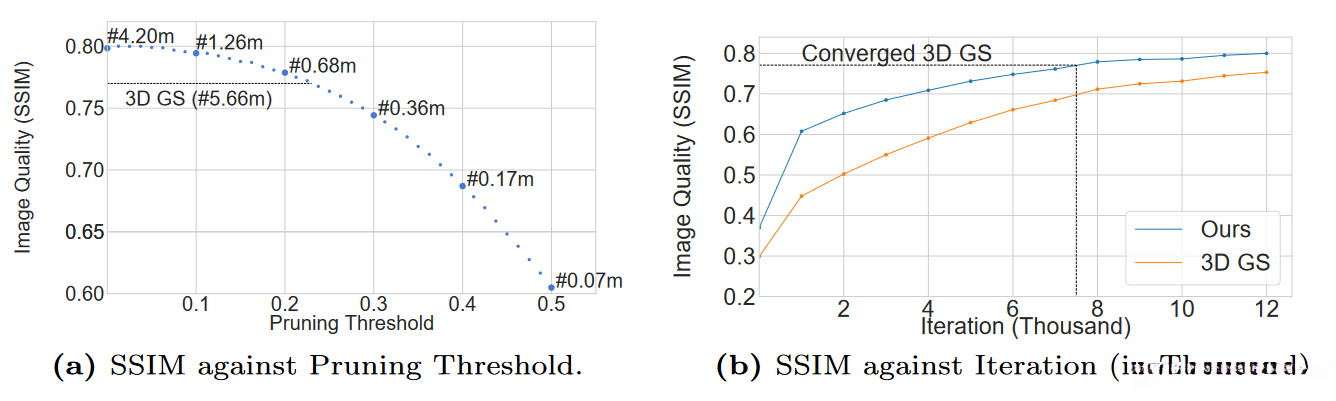 (b) We analyze the initial optimization trajectory between 3DGS and our default model (pruning threshold of 0.01) within the "Bicycle" setting. Our findings reveal a more pronounced improvement in SSIM metrics, demonstrating that our default model achieves comparable quality within fewer than 8,000 optimization steps.
