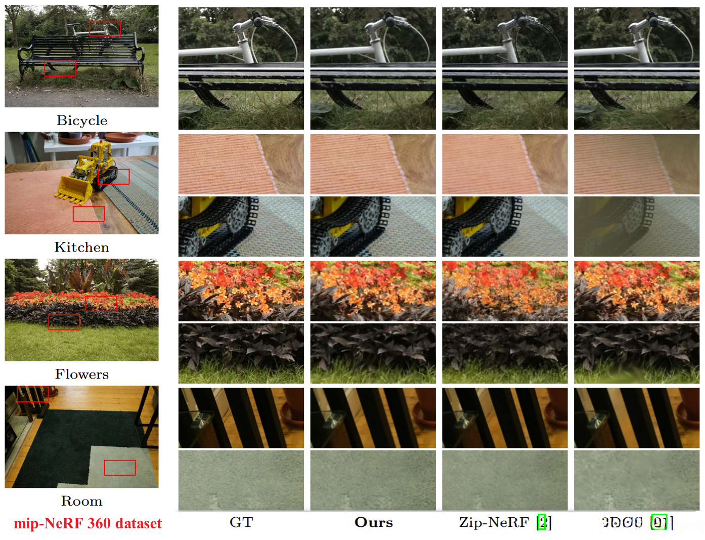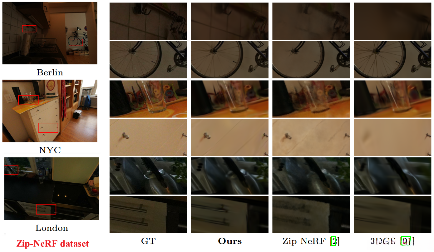 Unlike Zip-NeRF, our approach demonstrates superior performance by more effectively capturing not only high-frequency texture characteristics but also intricate geometric features. Specifically, it excels at depicting fine textures like tablecloths and carpets seen in kitchens and living rooms, as well as the detailed geometry of leaves, flowers, and bicycle wheels observed in urban settings such as Berlin.