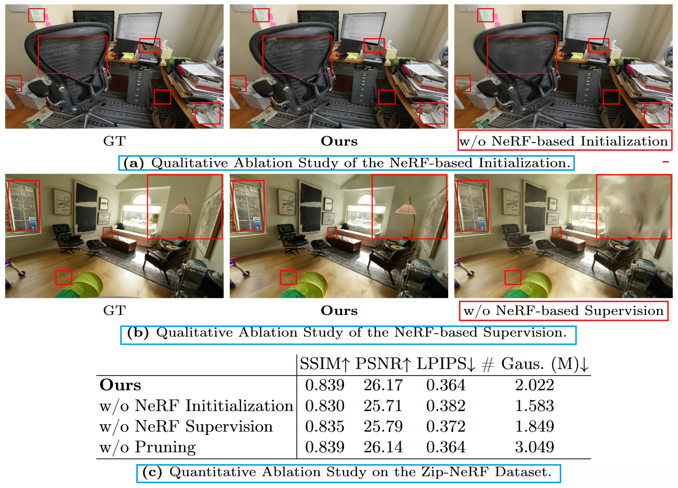 We showed that by utilizing radiance fields to serve as both a prior constraint and a supervision signal, we achieved enhanced outcomes in the optimization of point-based 3DGS representations.