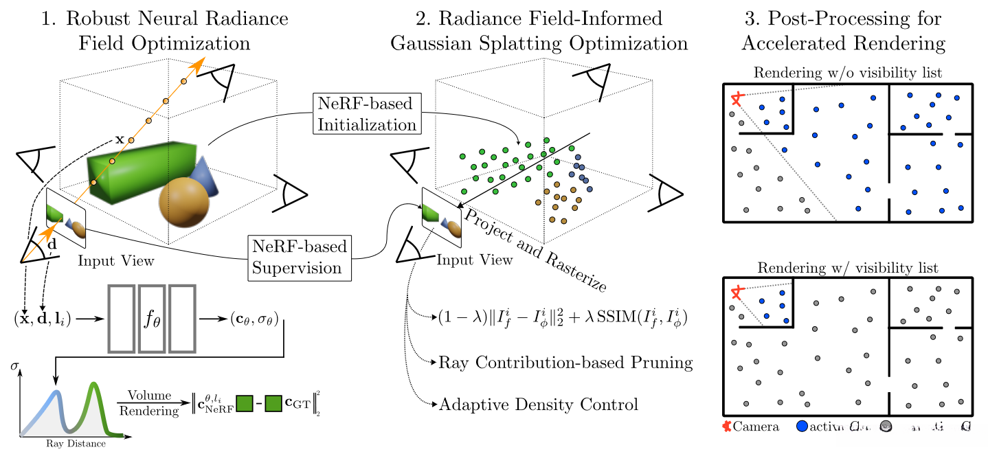 We use the radiance field before initializing and supervising our point-based 3DGS model that we utilize a novel pruning technique to enhance for more compact, high-quality scenes.