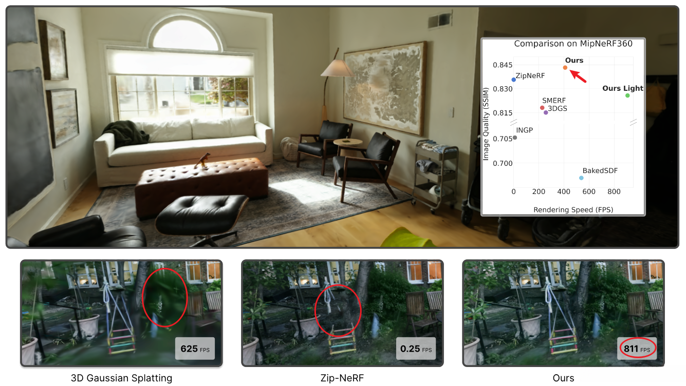 (bottom) In contrast to 3DGS, our method allows for robust synthesis of complex captures while rendering 3,000× faster than the SOTA inoffline view synthesis, Zip-NeRF.