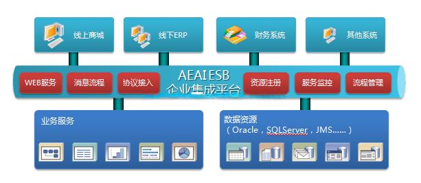 在本次综合开发项目中由于该公司上市的需求,需要快速实现系统对接。使用数通畅联AEAI ESB做集成业务系统,实现异构系统的互联互通,主要实现为将线上商城与线下ERP系统进行集成对接,线下ERP系统与财务系统进行集成对接。