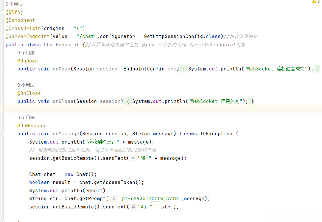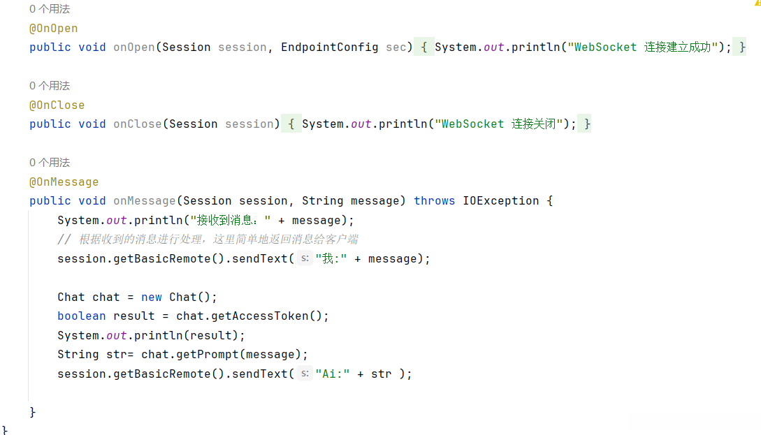 Chat类包含两个方法:利用两个key获取token,在利用token加“提示词”请求接口