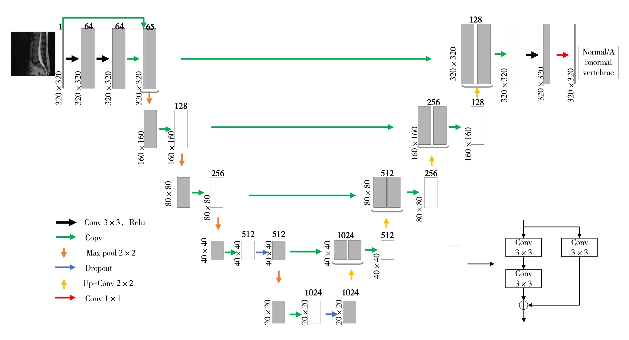 本文采用在医学图像分割领域表现出色的U-Net网络作为椎骨分割模型。其独特的U型结构使得在上采样过程中能够有效地融合下采样阶段所保留的高分辨率细节信息,在提升分割精度方面取得了显著效果[16]。针对过深网络可能导致的梯度爆炸和模型退化问题,残差网络(ResNet)通过引入层间跳跃连接机制得以有效解决。具体而言,在每层处理时会将输入与输出特征进行融合后进行激活并输出]