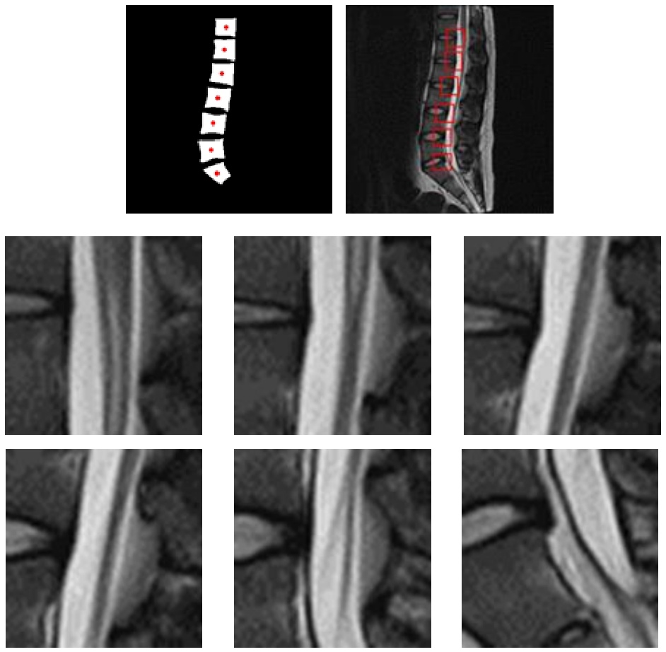 基于获取的所有椎骨中心点坐标的定位结果,在矢状位原始图像上执行裁剪操作。裁剪区域的具体尺寸参数由经验丰富的专业医生依据腰椎间盘病灶区域(ROI)的标准尺寸来设定,并且固定为统一的48×48像素范围。具体而言,在完成所有必要的解剖学定位后,在每个目标点位置的基础上向后延伸并截取相应的等大正方形窗格进行观察分析(如图7所示)。