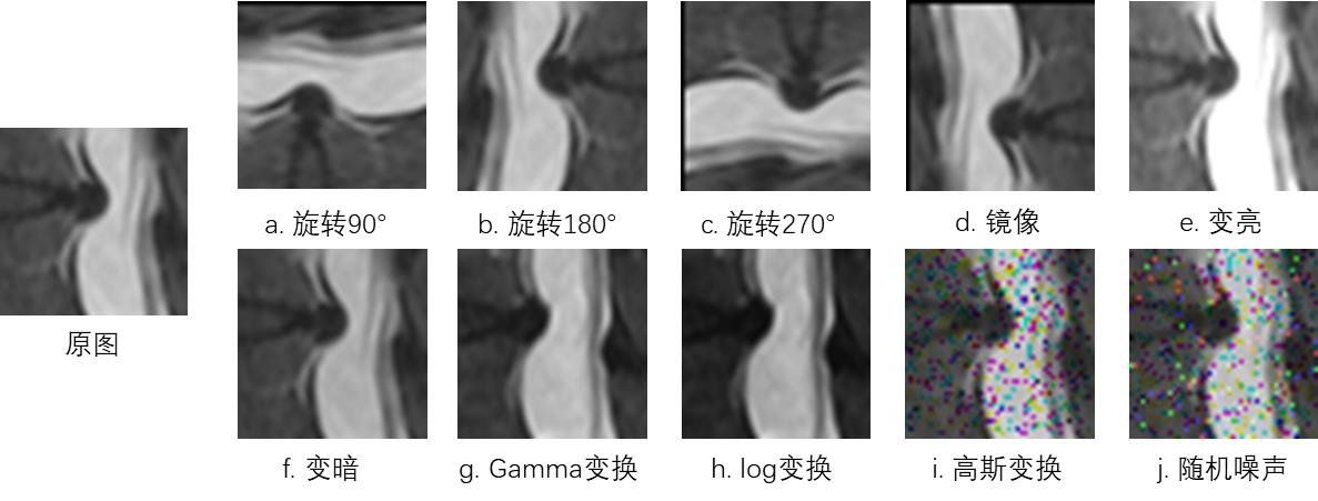 本文从54例腰椎间隙光核磁共振成像(MRI)病例中提取中心切片及邻近中心两侧的切片,并基于预训练优化的ResU-Net模型完成脊柱椎体分割及自动定位裁剪操作以获取目标区域(ROI),最终获得了1,082份样本数据(其中正常病例681例、突出病例401例)。鉴于所选病例的影像尺寸(48×48像素)偏小且样本数量有限,这将不利于卷积神经网络模型的有效特征提取与训练过程;因此建议对原始数据集实施增强处理以提高模型训练效果。