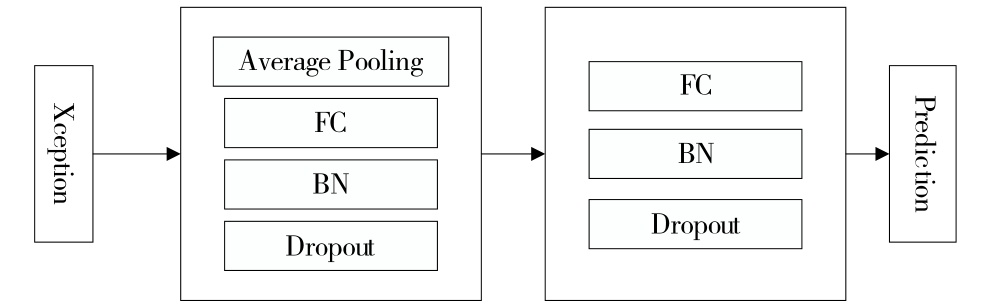 此外,在数据量规模偏小的情况下(考虑到)为了避免模型出现过拟合的风险(有效避免),本文采取了多项优化措施:首先,在Xception网络架构中(移除了原有的)原有全连接层,并增加了自己设计的专用分支结构;其次,在图像数据预处理阶段(经过归一化处理后)将其作为输入传递给网络;再次运用EarlyStop机制来有效抑制了模型过拟合的现象;最后采用了动态学习率策略以能够迅速且准确地收敛至最佳参数设置。这些改进措施使得优化后的网络架构得以在图3中清晰展示。