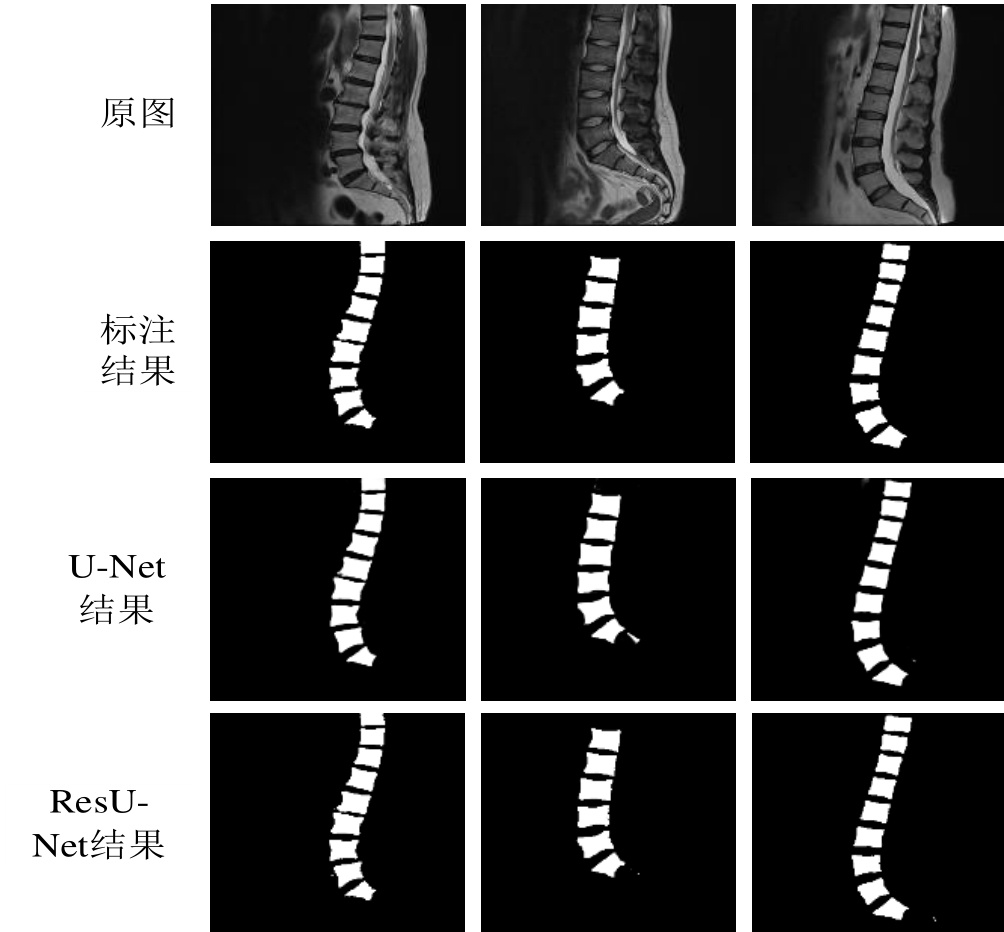 本研究采用ResU-Net网络对MR图像进行椎骨部位的分割任务求解,在经过多轮训练优化后成功获取了最佳性能的模型版本;随后将该模型应用于测试集数据集进行性能评估,并与经典的U-Net架构以及人工标注的标准进行了系统性对比实验;最终实验结果表明所提方法在分割精度方面优于现有算法(如图5所示)。