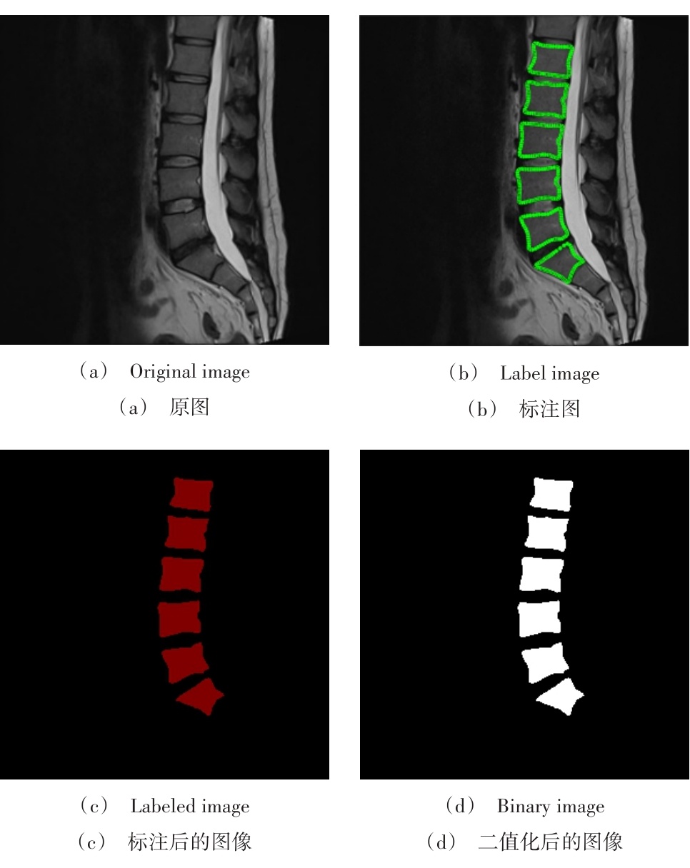 首先,在来自矢状位MR T2加权图像的54个病例中选择出用于训练的数据集共包含44组样本,并将剩余10组分别用作测试和验证用例。随后,在Labelme软件中对训练集进行椎骨区域的标注(如图4所示)。最后将图像进行二值化处理(如图4b所示),并将其作为模型训练的标签。整个标注过程在专业医师监督下完成,并确保所有处理后的图像尺寸一致(均为320×320像素),且深度保持在8位。