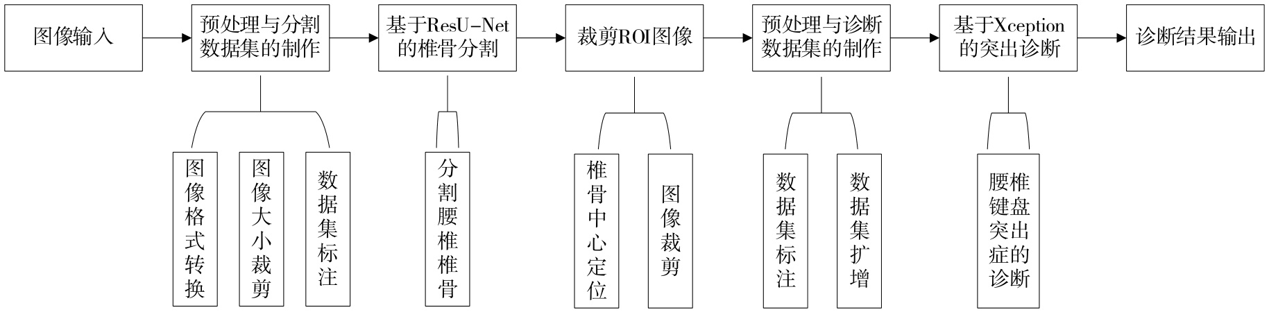 本研究提出了一种辅助诊断系统,该系统主要由两部分组成:第一部分利用ResU-Net模型实现椎骨区域的精确分割;第二部分则结合优化后的Xception网络架构对腰椎间盘突出症进行分类识别。具体算法设计及其工作流程可在图1中详细展示。
