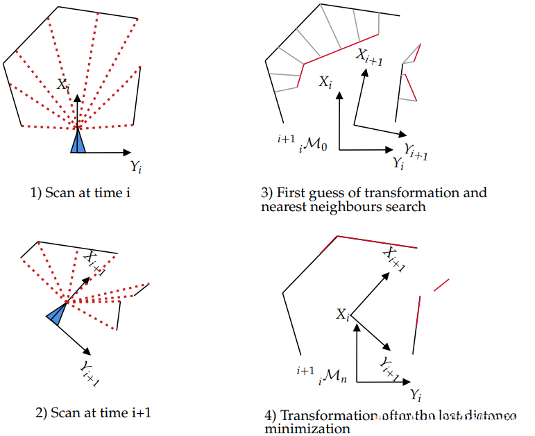 扫描配准 是基于LiDAR构建三维地图的关键步骤,在此过程中可获得精确的空间运动信息。三维点云注册 的标准方法是迭代最近点(ICP)算法[51]。关于其原理,请参见图4所示的内容。该方法的主要缺陷在于对点对应关系的计算开销较大且对初始值的高度敏感性。为了克服这些局限性,在实现ICP时通常会采用辅助数据结构以加速运算过程。例如,[47]中的研究指出通过引入 kd-tree 数据结构来加速最近邻搜索能有效提升算法效率。此外,[52]提出了一种改进型ICP算法——广义ICP(GICP),其核心思想是通过考虑扫描平面几何概率分布模型 来增强算法鲁棒性。作为另一种替代方案,极坐标配准法(PSM)[53]利用激光测距仪提供的极坐标信息来估计各点间的配准关系,从而实现精确配准功能