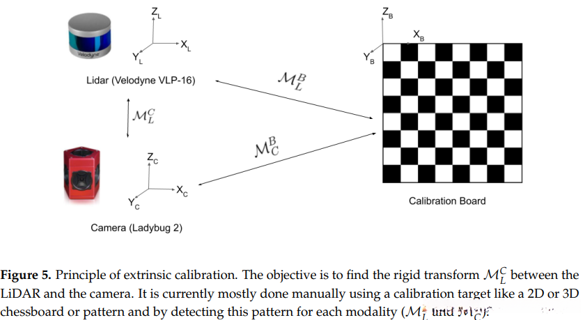 图5. 外参校准原理旨在在一个固定的坐标系中确定激光雷达与相机之间的刚性变换关系MCL。现在一般采用二维或三维标定板等校准目标,并通过检测每种标定板上的特定模式(如MBL和MCB)来实现此过程的人工操作。