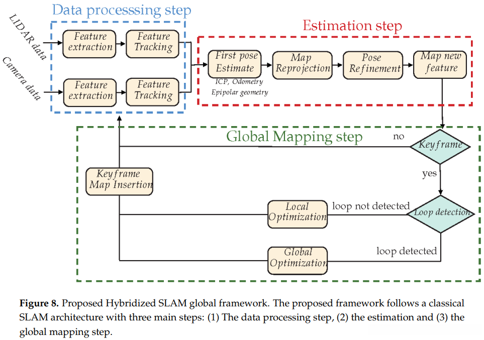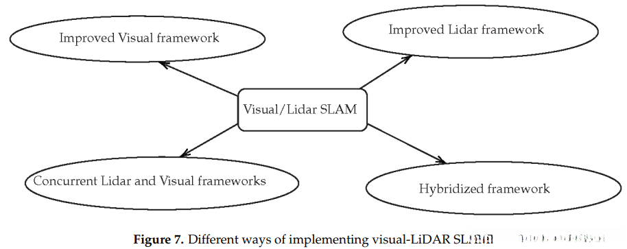 综上所述,在实现这种SLAM的所有方法中(如图7所示),对混合框架的研究仍显不足。 传感器融合技术主要是通过增添信息的方式为主导的技术手段之一,在仅依赖LiDAR或视觉的情况下发挥其作用。 基于视觉信息与激光数据构建通用型SLAM系统面临诸多挑战; 而更为紧密地结合使用的LiDAR与视觉传感器融合算法则尚未得到充分关注,并应在现有研究基础上进一步深入探索