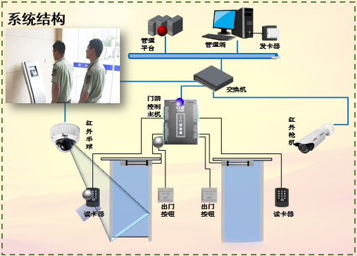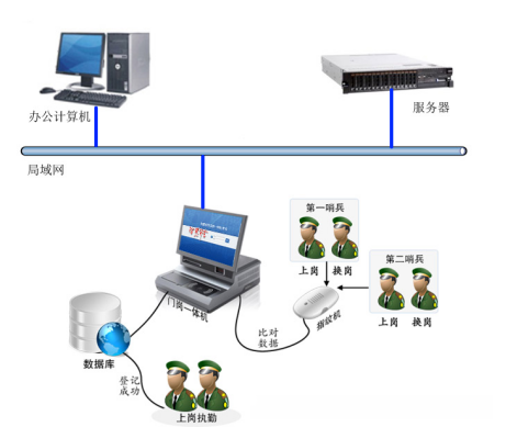 该系统采用集中式管理与分散式控制相结合的网络架构(即'中央管理站—现场控制器'型结构),旨在实现对相关区域的监控与管理功能。系统通过建立一个统一的营区网络平台进行整合协调。所有现场控制器均通过TCP/IP协议实现网络通信,并连接至总控室内设置的一个综合管理中心进行统一调度。该平台具备高度的安全性和灵活性,在线门禁状态监控、历史数据查询以及重要数据备份等核心功能均能得到有效保障。值得注意的是,在总控室内若发生计算机故障,则不影响各在线出入口运行;读卡及门的操作操作过程将不受任何干扰。