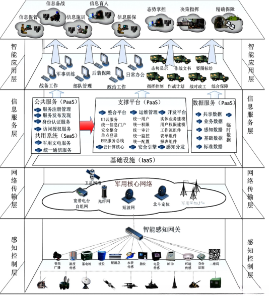 智慧军营作为智慧城市发展衍生出的一项创新课题,在部队战备工作阶段实现了智能化应用,在军事作战准备阶段以及日常训练模拟中以及后勤保障服务等方面实现了智能化应用,并主要依托物联网技术、云计算平台、北斗定位系统、下一代网络架构、高性能计算和智能数据分析等基础支撑,在部队日常办公和安全中心一整套体系下形成了完整的智慧化管理模式。这种管理方式不仅推动了业务流程向一体化协作模式转变的可能性,并且为未来军队管理提供了统一的信息平台支撑。