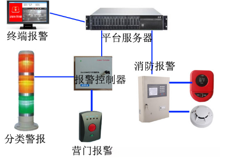 消防报警:报警信号首先传递至值周室和机关综合值室处,经值班人员分析后最终决定鸣响联动警报装置。