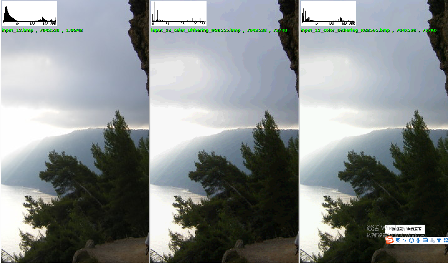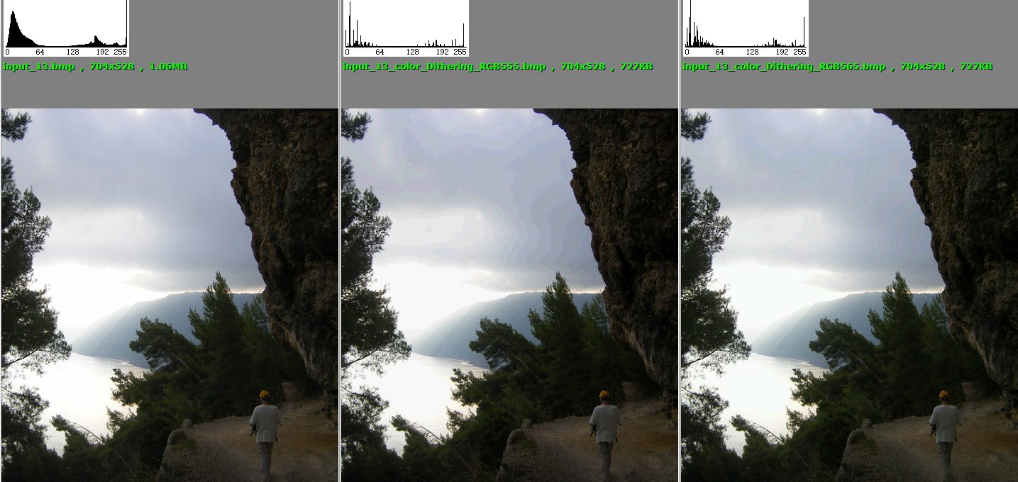 图像比较小的时候基本上看不出来差别,放大看才能看到RGB555的天空分层比RGB565严重些,因为损失的图像数据更多些。