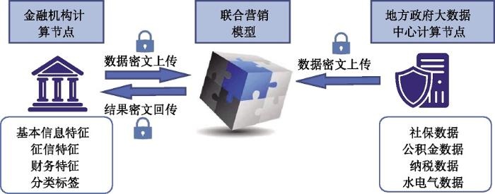 针对上述问题,当前金融机构正在逐步推进集团内部营销体系的拓展,并积极与中国地方政务机构建立合作关系,整合自身获取的金融属性相关数据,结合辖区企业经营状况、司法判决信息以及税务数据等信息资源,进一步提升银行客户标签维度,实现精准客群划分的同时降低营销成本(见图1)。由于地方政务数据能够覆盖辖区全部企业信息,这一资源池能够满足普惠金融业务营销所需客群范围,但与银行方收集的企业特征信息存在一定的重叠度差异。因此,金融机构在实际操作中首先通过与中国地方政务大数据中心建立合作关系,整合企业基础信息、征信记录、社保及公积金缴纳情况、税务缴纳记录等约400项企业特征指标;其次运用单变量回归模型进行初步筛选;随后依据业务背景意义及变量间的相关性进行深入优化筛选;最终确定特征精简列表后采用纵向联邦学习方法开展智能营销模型训练与预测工作,以识别不同行业企业的偏好特征模式;最终实现了普惠金融客群特征的丰富与目标企业定位目标的同时为特定企业提供适配型普惠金融服务重点定位目标,从而助力提升客户业务价值水平。在实际应用中发现:相较于单一模型策略的应用场景响应率提升了约15%至20%,模型评估指标AUC值及Kol伯格斯曲线(KS)值较单一模型提升了约5%至10%左右提升幅度