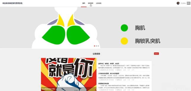 当用户打开系统的网址后,首先看到的就是首页界面。在这里,用户能够看到高校体育场馆预约管理系统的导航条显示首页、体育场馆、公告信息、个人中心。系统首页界面如图5-1所示: