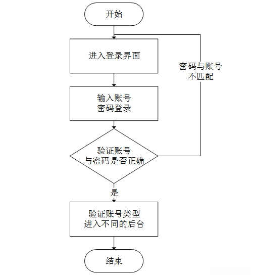 登录流程是该系统的第一个流程,登录的第一步是输入账号、密码登录,系统会验证账号与密码是否正确,正确时系统会判断账号类型再进入不同的后台;不正确时,会返回到登录的第一步,输入用户重新执行登录流程。该流程如图3-5所示。