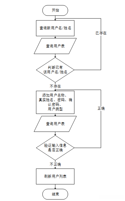添加新用户的流程是先查询新用户名是否已存在,如已有该用户名,需重拟用户名并同时输入新用户的其它信息,添加新用户到数据库时会先验证数据是否完整,信息都正确且完整时,返回并刷新用户列表;信息不正确时,会返回输入信息的那一步。该流程如图3-6所示。