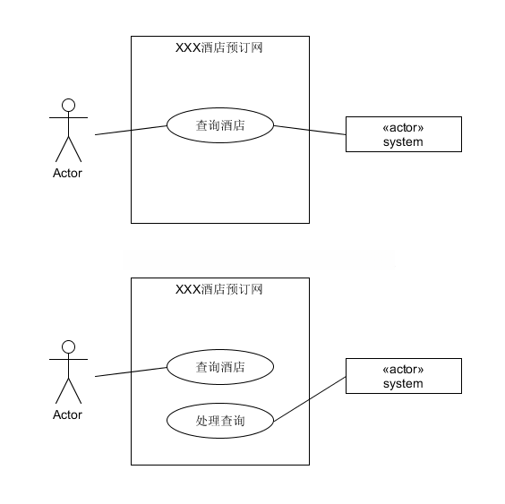 这样一个简单例子中,第一个用例图是合理的,而第二个用例图中,处理查询不应该放在酒店预订网的系统边界内。这个实在system内部完成的。