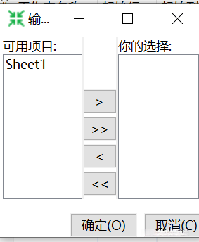 获取选中文件的工作表。单击【获取工作表名称…】按钮,弹出【输入列表】对话框,左边【可用项目】列表列出选中文件的所有工作表,如“物理成绩.xls”文件的“Sheet1”工作表,而右边【你的选择】列表列出被选中的工作表,如图所示。