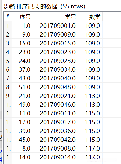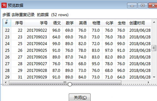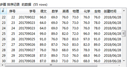 双击【排序记录】组件,对“学号”字段按照升序进行排序后预览数据,如图所示,除了“序号”字段数据外,“学号”分别为“201709023”“201709028”“201709030”的数据各有两条记录,并且对应的“语文”“数学”等考试科目和“创建时间”的数据也相同。