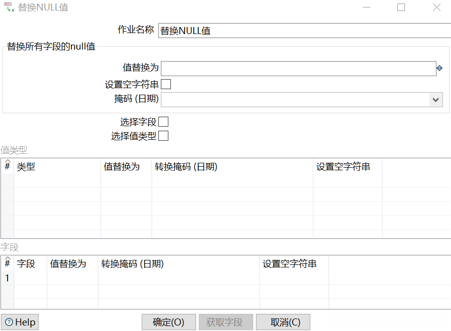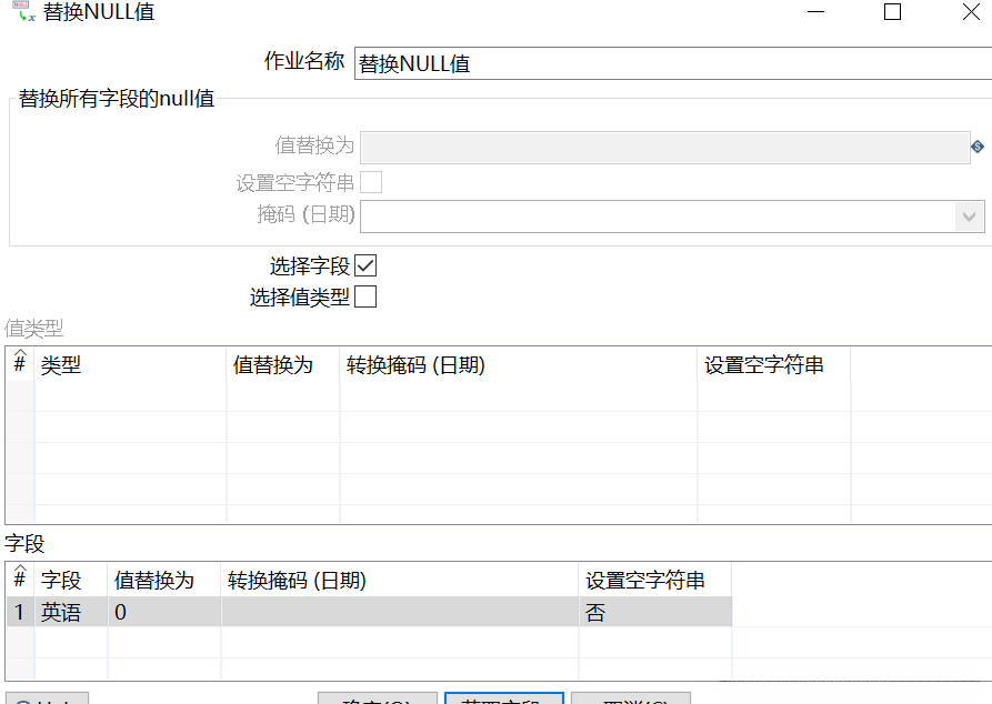 选择【选择字段】方式设置字段参数。【选择字段】设置为“√”,并在【字段】表中,对字段的参数进行设置。此时完成【替换NULL值】组件参数的设置,如图所示。