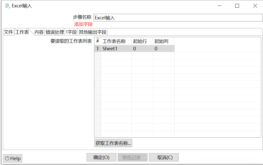 设置选中的工作表参数。单击【确定】按钮,将【你的选择】列表选中的“Sheet1”工作表添加至【要读取的工作表列表】表中进行参数设置,【起始行】和【起始列】参数都设置为“0”,此时完成【工作表】选项卡参数的设置,如图所示。