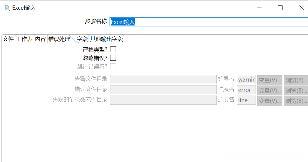 单击【错误处理】选项卡,如图所示,可对获取Excel文件时产生的错误处理参数进行设置,检查和定位错误位置,一般按照缺省值配置。