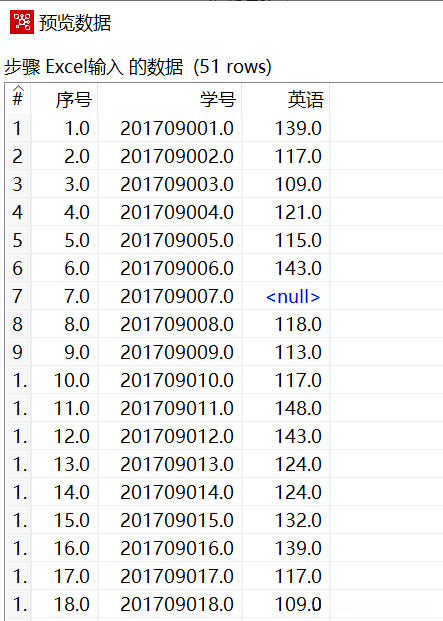 使用Ctrl+N快捷键,创建【替换NULL值】转换工程。接着创建【Excel输入】组件,设置参数,导入“2019年11月月考英语成绩.xls”文件,预览数据,“学号”字段数据为“201709007”所对应的“英语”字段数据为“