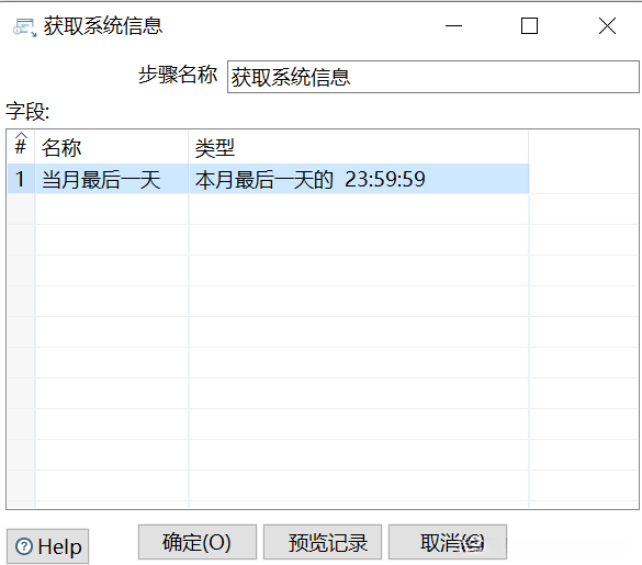 双击【获取系统信息】组件,弹出【获取系统信息】对话框,设置第1行参数。【名称】参数设置为“当月最后一天”。单击【类型】输入框,弹出【选择信息类型】对话框。选择“本月最后一天的 23:59:59”类型,如图所示,并单击【确定】按钮。